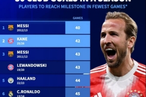 体育资讯4月16日讯 德转盘点了在本世纪五大联赛球员单赛季达成50粒进球最快纪录榜,其中本赛季凯恩42场位列次席。具体如下: