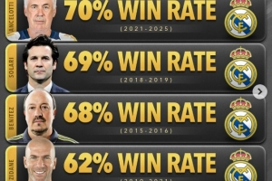2、安切洛蒂 70%(2021-25年)